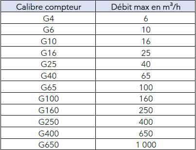 • Débit compteur : Volume maximal de gaz pouvant être mesuré par heure par le compteur (m3/h)